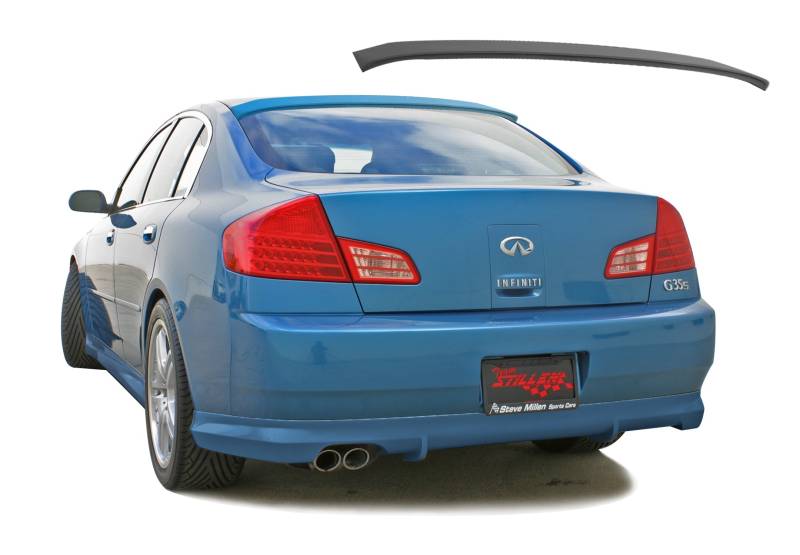2003-2006 Infiniti G35 Sedan Roof Spoiler - 103719MB Add an aggressive look to your Infiniti G35 Sedan with the STILLEN polyurethane roof wing. This wing is shipped ready for install. This STILLEN Roof Spoiler comes Matte Black. Personalize your G35 with STILLEN body styling products. Constructed of high quality polyurethane, these parts are flexible and durable. each one offers OEM fit, quality and finish.