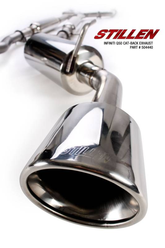 STILLEN Cat Back Exhaust for 2014-2015 Infiniti Q50 3.7 - 504440 STILLEN has long been associated with Infiniti tuning parts, creating high performance products, and meticulously crafted exhaust systems that have proven time and again to produce the maximum horsepower possible. With the introduction of the 2014 Infiniti Q50, STILLEN immediately went into R&D utilizing their many years of experience with VQ engines, and the results are fantastic.