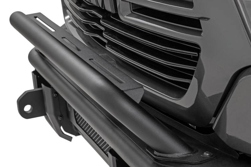 - Heavy-Duty D-Ring Set: Includes a 4.75-ton capacity D-ring set for secure recovery points.\ Integrated Skid Plate: Shields vital components from rocks, debris, and off-road hazards.\ Bolt-On Stinger Bar with Light Mount: Adds aggressive front-end protection while doubling as a mount for an LED light bar.\ Sensor-Compatible Design: Retains factory proximity sensors for seamless functionality.\ Durable Satin Black Finish: Corrosion-resistant coating for a sleek, long-lasting appearance..
