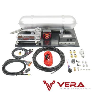 The Evo Bluetooth management allows for in vehicle operation, through included RF remote or through our free iOS or Android app. Three sensor digital gauge allows for easy access to vital air pressure information (front, rear and tank). With LCD display, user defined font and background colors, high/low pressure alerts and voltmeter. Includes all parts necessary for complete air suspension install when paired with TruHart Air Struts.