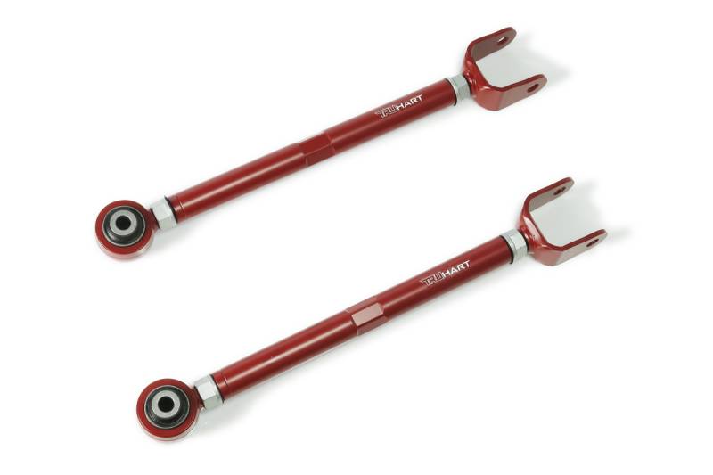 TruHart rear trailing arms replace your factory arms with strengthened adjustable arms. Our toe arms utilize hardened rubber bushings which allows for less deflection and provides a more direct feel road feel than OE bushings.