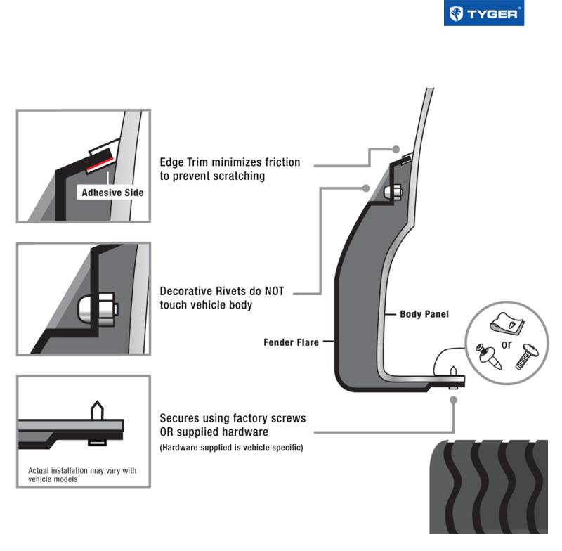 - Hardcore - Rugged appearance bolstered by recessed stainless steel rivets emphasizes their enormous presence. TYGER's upmarket, trim grade Pocket Style Fender Flares never disappoint.