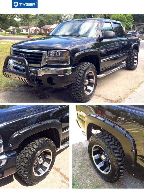 TYGER fender flares are made of impact-resistant polypropylene with developed injection molding technology. The pocket bolt-on riveted style gives your pickup a customized off-road look and adds significant tire coverage to keep dirt and debris off the vehicle!