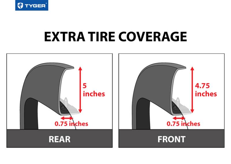 - Dimensions - Flare Height: 4.75.0 Inch front and 5.0 Inch rear. Tire Coverage: 0.75.0 Inch front and rear.