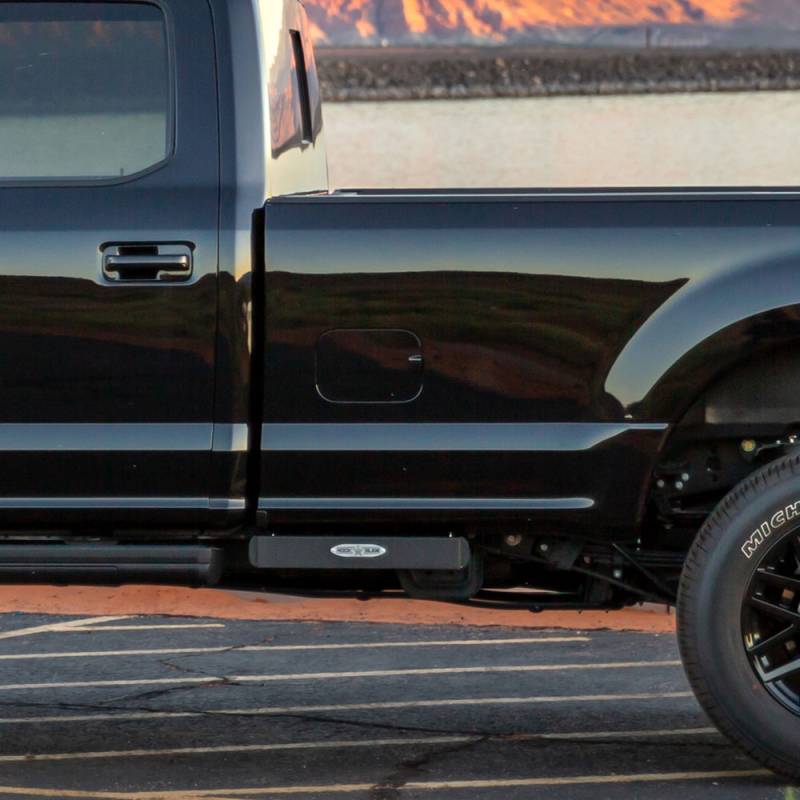 Fold out two-step system for pickup bed access. Comes with Ford Super Duty brackets to mount in front of drivers side rear wheel. 16 inch wide stepping surface, mounts to frame underneath truck bed. Stainless steel internals and powder coated black box.