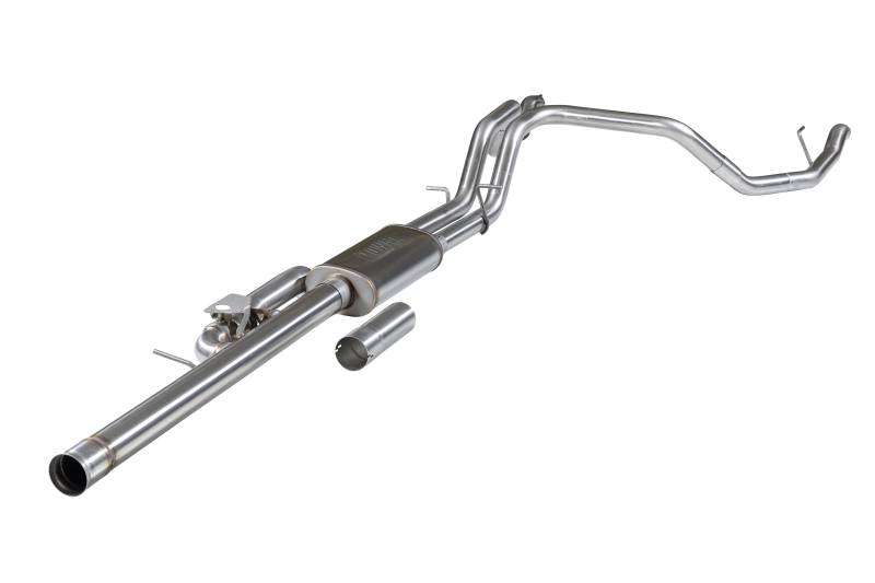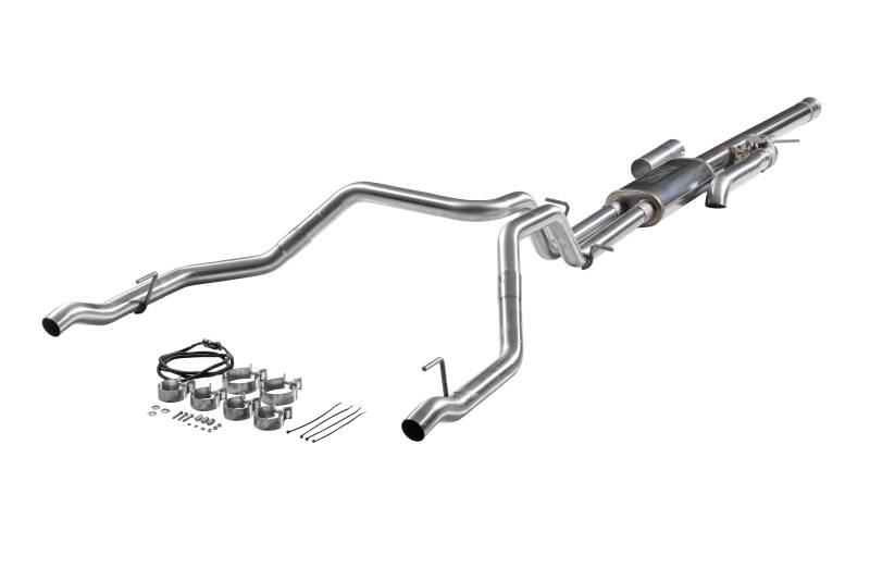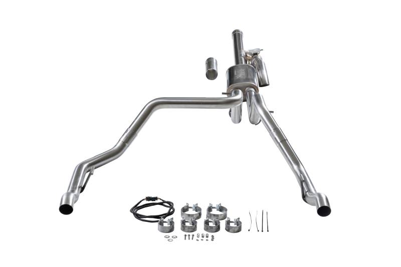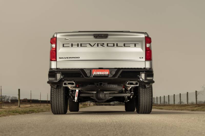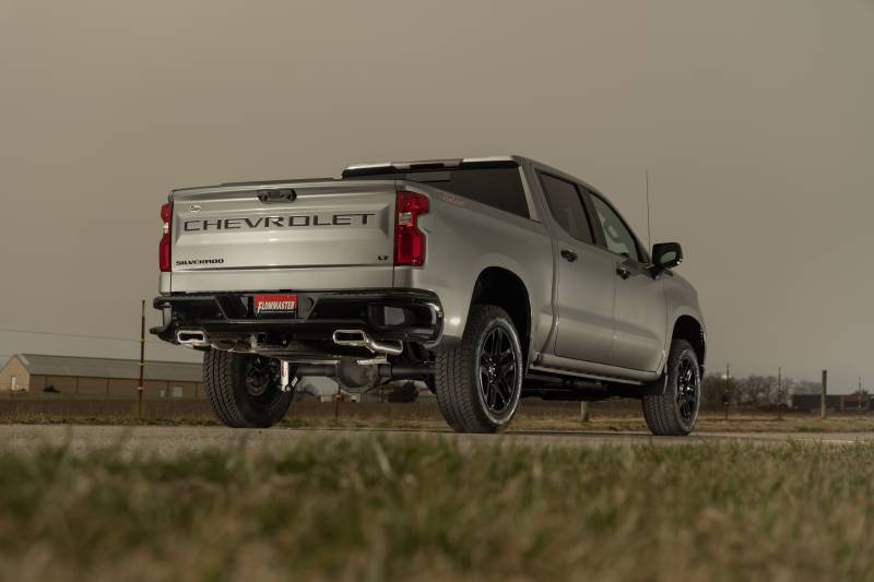 Flowmaster's® Flow FX® Cat-back exhaust system for the 2024 to 2026 GM 1500 trucks with the 6.2-liter engine is a great way to customize your Silverado or Sierra to your personality. This performance exhaust system fits both 2/4 Wheel drive models and is manufactured from 409 stainless steel for years of trouble-free service and performance. Features include a 3.50-inch inlet pipe leading into a specialty tuned Flow FX style muffler for great sound and maximum performance. This cat-back system has dual 2.5-inch mandrel-bent tailpipes that exit in the bumper cut-out locations and retains the factory exhaust bezel for a clean look. Included in this cat-back system is active valve control with an integrated turndown. This allows you to control the factory valve from the dash with the different drive modes for full control of your sound level. Run the valve closed in the Normal drive mode, or open the valve in Sport or Off-Road mode for maximum sound. Max dyno gains of 15 hp and 13 lb-ft at the rear wheels deliver power you can feel. These systems use all the factory hanger locations and connections for an easy installation that you can do at home. Kit include installation instructions and all necessary hardware. Backed by Flowmaster's Lifetime Limited Warranty.