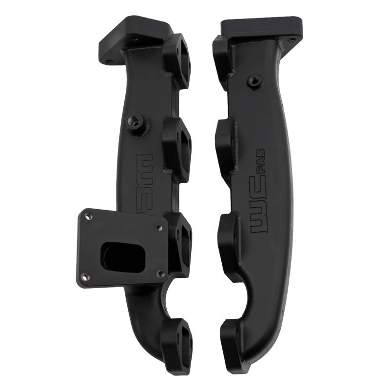 Billet Exh Manifold & Stainless Up Pipe KT w/ Gaskets & Hardware, 17-25 D-Max WCFab's 2017-2025 L5P Duramax Billet Exhaust Manifolds replace the restrictive factory cast parts with high-strength, TIG-welded high-flow billet steel components. These manifolds are exhaust port gasket matched and internally divided for optimal flow with OEM or ported cylinder heads. Outlet locations allow full compatibility with OEM style up pipes and are paired with WCFab's 2" Stainless High-Flow Up Pipes for optimized performance. Fully compatible with vehicle emissions system, these L5P Manifolds include the necessary sensor port and EGR riser flange. Includes new gaskets, ARP 12PT fasteners, and assembly lube for easy install. Finished in Black Ceramic Coat rated for 2000 deg F. Fully TIG Welded, CNC machined billet steel exhaust manifolds Finished in Black Ceramic Coat rated for 2000 deg F Includes new gaskets for manifolds & up pipes Includes ARP 12PT Fasteners and Washers 1/8 NPT port (and optional plug) included in driver side manifold for installation of EGT or drive pressure sensor