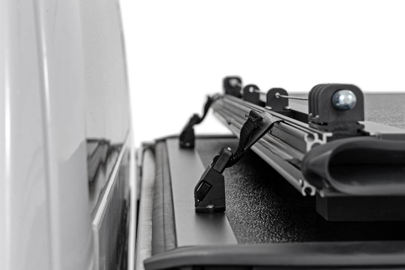 Rough Country's Hard Low-Profile Bed Cover is built for drivers who demand clean styling, real protection, and effortless access. This tri-fold hard tonneau cover sits flush with your bed rails, delivering a sleek, low-profile look while locking down your cargo with rugged aluminum construction. Designed for everyday use and weekend adventures alike, this cover blends durability, security, and convenience into one streamlined upgrade.Ultra Low-Profile Style: Skip the bulky bed covers. This flush-mounted design pairs rigid aluminum panels with a matte black finish for a modern, off-road-ready appearance that complements your truck without compromising bed space.Quick Tri-Fold Access: Need fast access to your cargo? The tri-fold design opens in seconds, allowing you to run fully closed or safely drive in the 2/3 open position using integrated nylon safety straps.Secure, Auto-Latching Protection: An automatic latching system engages when the cover is closed, working in conjunction with your tailgate lock to keep tools, gear, and valuables protected from unwanted access.Built Tough for Any Weather: Heavy-duty aluminum panels and a corrosion-resistant black powder coated frame deliver long-lasting strength, while integrated drain tubes help manage water and keep your bed dry.Simple No-Drill Installation: Designed for an easy bolt-on install, this cover mounts using a secure track and rail system with all hardware and tools included, so you can spend less time installing and more time driving.Confidence-Backed Durability: Backed by Rough Country's 5-Year Warranty, this hard low-profile tonneau cover is built to perform and engineered to last.Upgrade your truck with a bed cover that delivers sleek styling, dependable security, and effortless functionality. Rough Country's Hard Low-Profile Bed Cover is the perfect finishing touch for drivers who refuse to compromise.