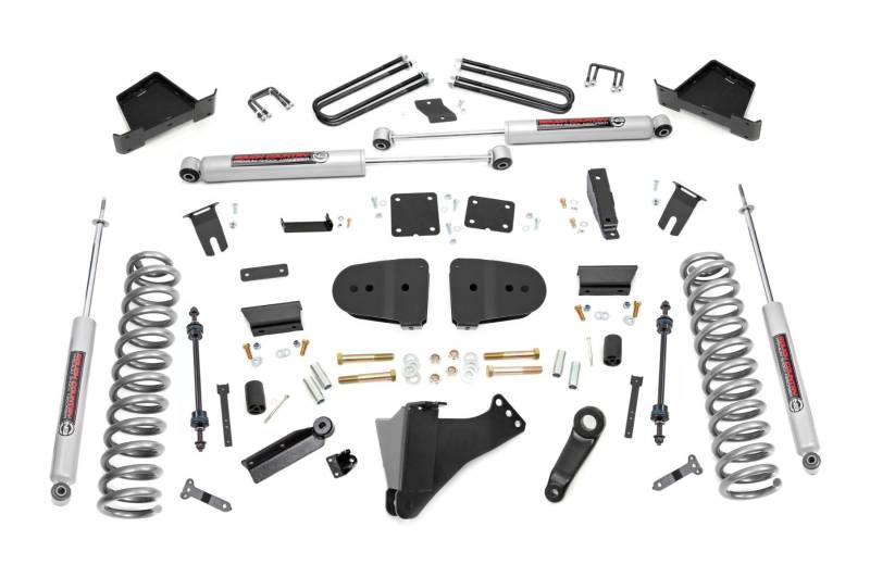 Level Up Your Super Duty Stance: Transform your fifth-generation Ford F-250/F-350 Super Duty with Rough Country's 4.5" Suspension Lift Kit, the perfect solution for eliminating factory rake and gaining a bold, aggressive profile. This front-to-rear leveling kit not only boosts ground clearance but also delivers a clean, commanding look that dominates both street and trail.Engineered for a Smooth, Balanced Ride: Lifted front coil springs deliver additional ride height without compromising comfort or control. Radius arm drop brackets correct caster alignment, preserving your truck's factory handling and ride quality. Meanwhile, sway bar drop brackets and a track bar ensure everything stays at the ideal geometry for a balanced, predictable driving experience.Built to Last, Mile After Mile: This kit includes heavy-duty fabricated rear blocks, engineered to outlast and outperform standard cast blocks. Anti-axle wrap rear blocks help eliminate common lift-related issues while maintaining factory ride quality. Whether loaded down or running empty, this suspension system stays smooth and reliable.Customize Your Performance: Choose the shocks that match your driving style: our rugged N3 series for a versatile balance of highway comfort and off-road capability, or upgrade to V2 Monotube shocks for enhanced performance with lightning-fast response and heat dissipation. The power to personalize your ride is yours.Simple Installation. Serious Results: With a 100% bolt-on design, this lift kit installs easily no cutting, no drilling, and no hassle. Plus, it clears up to a 35" tire with the proper wheel backspacing, giving you the freedom to run the setup you've been dreaming of.Rough Country Has You Covered: Every Rough Country 4.5" Suspension Lift Kit is backed by our Limited Lifetime Replacement Warranty, so you can lift with confidence.