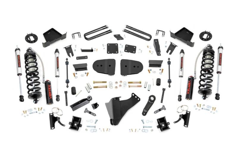 Conquer with Confidence: Elevate your fifth-generation Ford Super Duty with Rough Country's 6-Inch Coilover Suspension Lift Kit. Designed for serious off-roaders and daily drivers alike, this performance-driven system delivers aggressive ride height while preserving smooth, factory-like comfort. Run up to 37-inch tires with confidence and dominate terrain like never before.Precision Engineering. Premium Ride: Fine-tune your stance and clearance with fully adjustable Vertex coilovers that dramatically enhance damping performance for a smoother, more responsive ride. Each coilover features an 8-stage adjustable, 2.5-inch piston with nitrogen-charged monotube design and external reservoirs offering 56% more fluid capacity than standard shocks for unmatched heat dissipation and consistency. A secondary V2 front monotube shock adds even more stability and control, making this a dual-shock setup that stands above the rest.Built to Outlast: Heavy-duty 1/4-inch fabricated coilover mounts ensure maximum strength and durability under the harshest conditions. Radius arm drop brackets provide proper caster correction to maintain factory-like handling, while heavy-duty fabricated rear lift blocks deliver superior strength compared to cast alternatives. Rear blocks are also custom-engineered to prevent axle wrap, preserving your ride quality mile after mile. Pair with optional V2 or Vertex rear shocks for four-corner performance you can feel.Smarter Installation. Better Results: This bolt-on system is designed for a hassle-free setup no cutting or drilling required. Top-mounted reservoir brackets offer clean, secure placement, and front-to-rear leveling eliminates factory rake for a more aggressive, balanced look. Boosted ground clearance allows you to tackle trails with ease, while enhanced suspension geometry keeps your Super Duty performing as it should.Peace of Mind Included: Backed by Rough Country's Limited Lifetime Replacement Warranty, this 6-Inch Coilover Suspension Lift Kit is built to last and protected from structural or workmanship defects from day one. Drive harder, ride smoother, and lift smarter with Rough Country.
