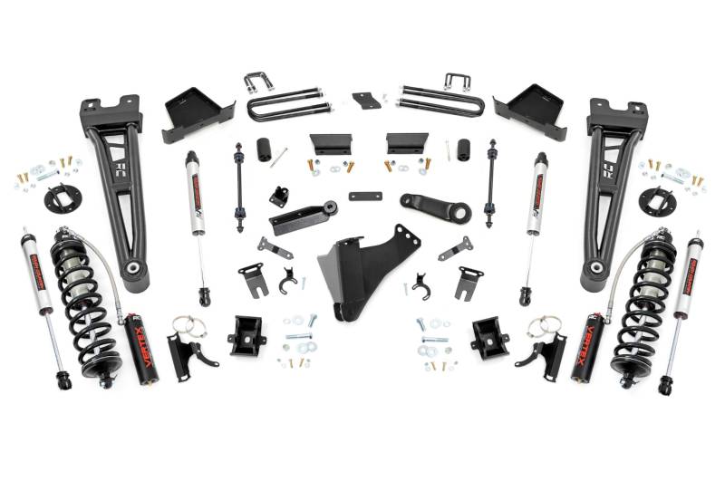 Conquer with Confidence: Elevate your fifth-generation Ford Super Duty with Rough Country's 6-Inch Coilover Suspension Lift Kit. Built for off-road warriors and everyday drivers alike, this performance-driven upgrade delivers aggressive ride height without sacrificing comfort. Run up to 37-inch tires and take command of any terrain with confidence and control.Adjustable Performance, Superior Ride: Fine-tune your stance with fully adjustable Vertex coilovers designed for maximum clearance and responsiveness. These 2.5-inch, nitrogen-charged monotube coilovers feature 8-stage adjustability and external reservoirs offering 56% more fluid capacity for cooler, more consistent performance. A secondary V2 monotube shock at each front corner creates a dual-shock setup that enhances stability and control on every journey.Stronger by Design: Heavy-duty 1/4-inch fabricated coilover mounts ensure maximum strength and durability under the harshest conditions. Tubular radius arms feature a massive 2-inch outer diameter, precision-fit for OEM mounts, maintaining a factory-like suspension angle while delivering unmatched strength. Durable rubber bushings help absorb vibration, promoting a smoother, quieter ride on or off the road.Enhanced Rear Suspension: Heavy-duty fabricated lift blocks outperform cast alternatives in strength and reliability. Anti-axle wrap rear blocks preserve factory ride quality while eliminating unwanted axle movement. For all-terrain control, upgrade with optional V2 or Vertex rear shocks to complete a four-corner performance package.Hassle-Free Installation: This system is fully bolt-on, no cutting or drilling required. Top-mounted reservoir brackets ensure clean, secure placement, while front-to-rear leveling eliminates factory rake for a more aggressive, balanced stance. Boosted ground clearance improves off-road capability, and enhanced suspension geometry keeps your Super Duty performing at its best.Backed by Confidence: Covered by Rough Country's Limited Lifetime Replacement Warranty, this 6-Inch Coilover Lift Kit offers peace of mind with every mile. Drive harder. Ride smoother. Lift smarter with Rough Country.