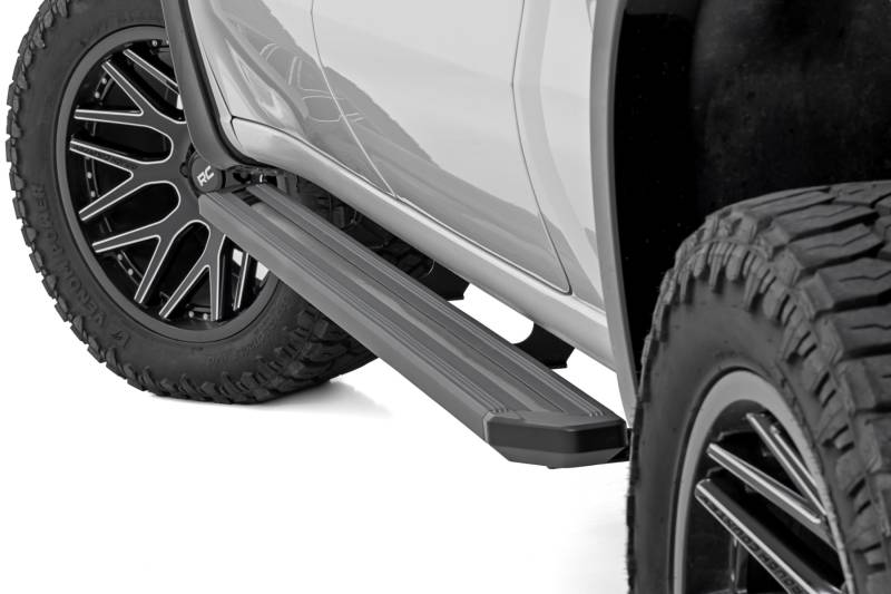 - Hassle-Free Bolt-On Install: No drilling required for a quick and easy setup.\ Enhanced Accessibility: Provides easier entry and exit from your truck.\ Cab-Length Coverage: Sleek design extends the full length of your cab.\ Durable One-Piece Aluminum Build: Strong, lightweight, and corrosion-resistant.\ Durable Protection: Corrosion-resistant black powder coat finish shields against rust, wear, and the elements for long-lasting performance.\ Extra Protection: Shields your vehicle from road debris and rock chips.\ Sleek Frame Coverage: Helps conceal exposed frame components for a cleaner look.\ Body Lift Compatible: Works seamlessly with or without a body lift.\ Bluetooth Controlled: Effortlessly manage your running boards with a seamless wireless connection.\ Customizable Step Lighting: Adjust the on-time from 1 second to 10 minutes when manually activated.\ Integrated LED Strip: Enhances visibility and style with built-in illumination.\ RC Puddle Lights Included: Provides extra lighting for safer vehicle entry and exit.\ 234 Color Options: Choose from a wide spectrum of vibrant colors to match your style.\ Five Preset Color Saves: Save up to five of your favorite lighting settings for quick access.\ 12 Dynamic Effects: Select from a variety of lighting effects to create a custom look.\ Limited Lifetime Warranty: Backed by Rough Country's lifetime warranty against material and workmanship failures - including welds, brackets, and structural components - for the original purchaser.