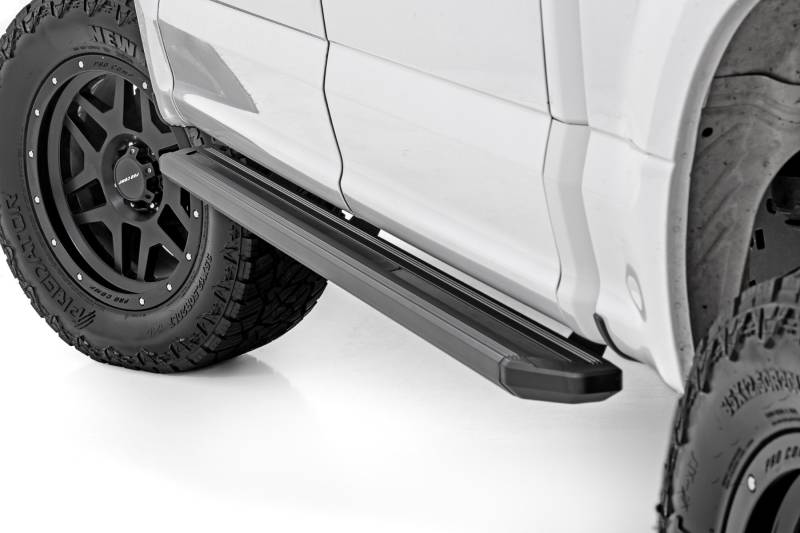 - Hassle-Free Bolt-On Install: No drilling required for a quick and easy setup.\ Enhanced Accessibility: Provides easier entry and exit from your truck.\ Cab-Length Coverage: Sleek design extends the full length of your cab.\ Durable One-Piece Aluminum Build: Strong, lightweight, and corrosion-resistant.\ Durable Protection: Corrosion-resistant black powder coat finish shields against rust, wear, and the elements for long-lasting performance.\ Extra Protection: Shields your vehicle from road debris and rock chips.\ Sleek Frame Coverage: Helps conceal exposed frame components for a cleaner look.\ Body Lift Compatible: Works seamlessly with or without a body lift.\ Bluetooth Controlled: Effortlessly manage your running boards with a seamless wireless connection.\ \ Customizable Step Lighting: Adjust the on-time from 1 second to 10 minutes when manually activated.\ \ Integrated LED Strip: Enhances visibility and style with built-in illumination.\ \ RC Puddle Lights Included: Provides extra lighting for safer vehicle entry and exit.\ \ 234 Color Options: Choose from a wide spectrum of vibrant colors to match your style.\ \ Five Preset Color Saves: Save up to five of your favorite lighting settings for quick access.\ \ 12 Dynamic Effects: Select from a variety of lighting effects to create a custom look.\ \ Limited Lifetime Warranty: Backed by Rough Country's lifetime warranty against material and workmanship failures - including welds, brackets, and structural components - for the original purchaser.