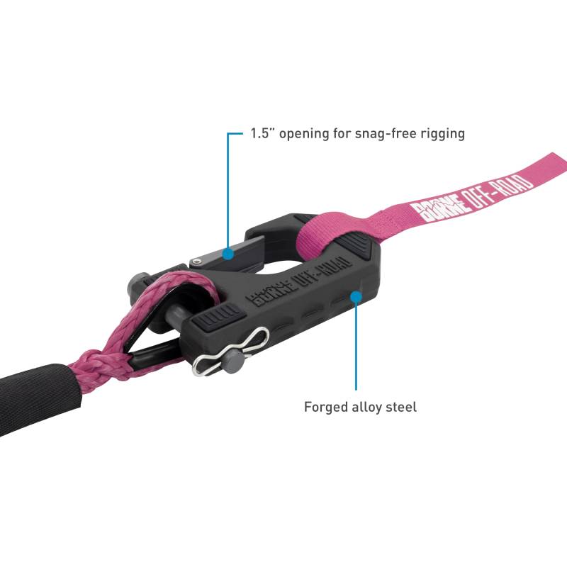 Borne Off-Road Replacement Synthetic Winch Rope, Hook, and Tether Strap, Pink Our Borne Off-Road replacement rope, hook, and tether kit contains an 85-foot high-performance 3/8” synthetic winch rope, a lifeline for demanding recovery operations. It is ideal for various winch uses and has exceptional strength to help in any situation. It includes an anti-abrasive sheath to prevent abrasions for durability and reliability and a tether strap to help pull or guide the rope during operation and keep your fingers safe from snags. Crafted from premium synthetic materials to conquer the most demanding challenges, it offers a smooth, controlled pull that inspires confidence. Ropes come in five colors to match your ride. -- In addition, our high-performance recovery winch hook is the linchpin of your recovery or rescue operations. Crafted from forged alloy for exceptional strength, durability, and reliability, it includes a 1.5” opening for snag-free rigging. Our hooks are powder-coated for rust resistance, conquering the most demanding challenges whenever you need them. The rope has a high-capacity strength to be used with the Borne Off-Road 10k and 12k winches Anti-abrasion sheath included on rope to protect against wear and tear Our hook is crafted from forged alloy and features a 1.5” opening for snag-free rigging
