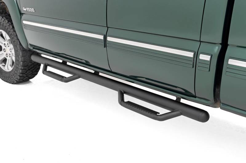Climbing into your truck should never feel like a workout. With Rough Country's all-new bolt-on Nerf Steps, getting in and out is a breeze. Experience effortless access and elevate your truck with a sleek, durable upgrade. Enhanced Undercarriage Protection: Say goodbye to road debris, rocks, and obstacles that could damage your undercarriage. Our Nerf Steps act as a shield, protecting your vehicle from the harsh elements below.Integrated Stone Guards for Added Protection: Keep your Chevy/GMC looking like new. The built-in stone guards effectively deflect kicked-up rocks and debris, preserving your vehicle's paint job from potential damage.Sleek, Streamlined Design: No bulky bars here, just a clean, high and tight profile that follows your cab's contours. These Nerf Steps provide a polished, streamlined look that enhances your truck's rugged yet refined style.Built to Endure: Crafted from .084 wall, corrosion-resistant tubing, these Nerf Steps are engineered to withstand anything the road or trail throws at them. From muddy trails to harsh environments, they'll handle it all while staying tough and reliable.Quick and Easy Installation: No drilling required, just bolt them on and enjoy a hassle-free installation. Spend less time working and more time exploring with this straightforward, user-friendly design.Limited Lifetime Warranty: Backed by Rough Country's Limited Lifetime Warranty, these Nerf Steps provide lasting durability and peace of mind for years to come.Step up your truck's style and protection with Rough Country Nerf Steps. Easy installation, superior defense, and a sleek, high-end design, everything you need to take your vehicle to the next level.