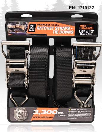 1.5" x 12ft Stainless Ratchet Strap (2-pack) Take on heavier loads with the Mile Marker Stainless Steel Ratchet Straps (1.5" x 12ft, 2-pack). Designed for medium-duty applications, these straps boast a 3,300 lbs break strength, making them ideal for securing larger ATVs, UTVs, motorcycles, and cargo loads. Built with stainless-steel construction, they offer corrosion resistance and long-lasting durability. The precision ratcheting mechanism ensures a tight, secure hold with smooth operation, while the weather-resistant webbing resists UV damage and moisture. Wide hook attachments provide a strong connection to anchor points, reducing the risk of slippage. For added ease, the ergonomic rubberized grip enhances comfort, and the quick-release system makes unloading fast and effortless.