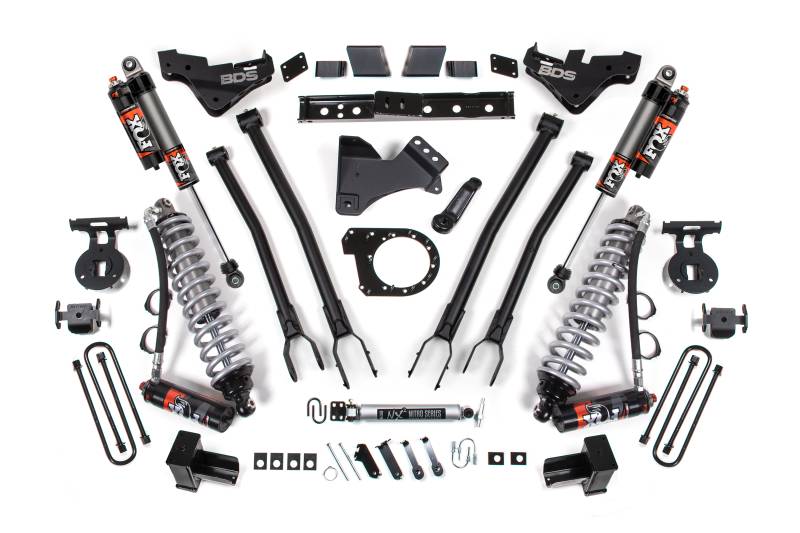 Maximize the capability of your dual rear wheel Ford F350 Super Duty diesel powered truck with this 4-inch lift kit with 4-Link and FOX 2.5 Performance Elite Coilover conversion from BDS Suspension. Designed to improve stance, performance, and capability, this kit includes everything necessary to set your dually truck up right with clearance for up to 38" tires.
