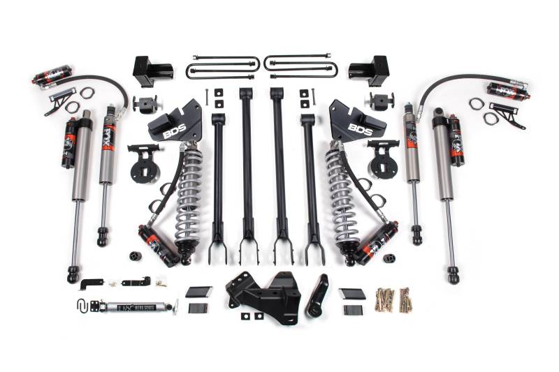 Maximize the capability of your 2017-2019 Ford Super Duty diesel powered truck with this 4-inch lift kit with 4-Link and FOX 2.5 Performance Elite Coil-over conversion from BDS Suspension. Designed to improve stance, performance, and capability, this kit includes everything necessary to set your truck up right with clearance for up to 37" tires.