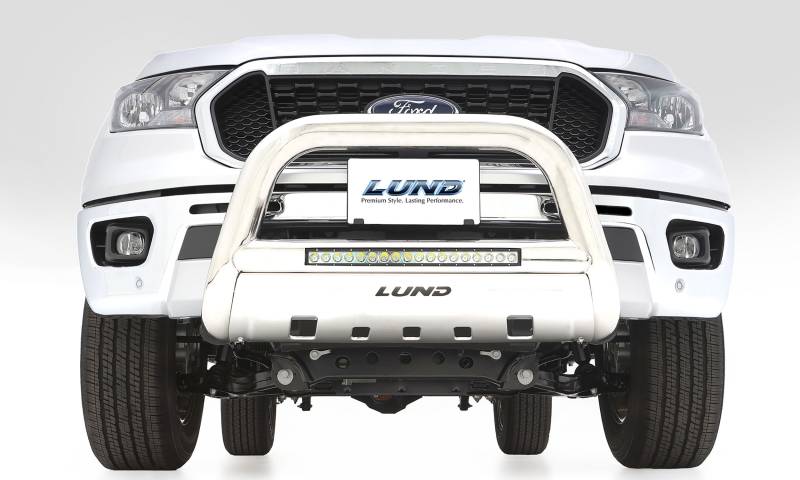 Bull Bar With Led Light Bar-Stainless Steel Lund 3.5In. Oval Bull Bars deliver a tough, heavy-duty look on your truck?s front end while providing bumper and grill protection. The integrated 20in. LED light bar will light up the trail and improve your night visibility. Constructed from 3.5 in. oval heavy-duty steel bars Available in 304 stainless steel or black powder-coated steel Integrated 20" LED light bar (flood beam pattern; 54 watt, 3k actual lumens) Wire harness and in-cab switch are included Includes a steel skid plate with LUND(R) logo