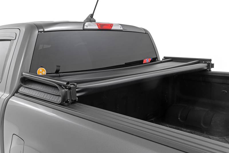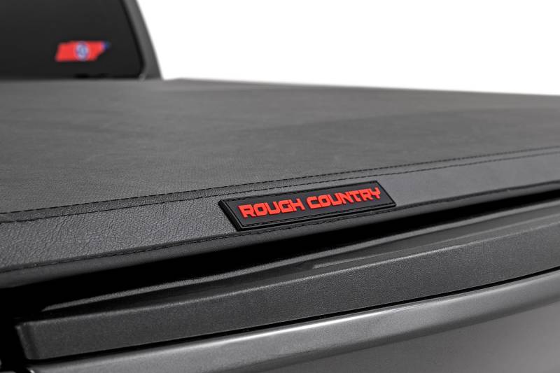 Want to streamline your ride and protect your gear from the elements? Look no further than Rough Country's Tri-Fold Vinyl Tonneau Cover! With its durable construction and easy installation, it's the perfect addition to any truck.\ Tri-fold Design for Style and Efficiency: This tonneau cover folds up in three sections for easy access to your bed whenever you need it. Need to haul a large item? Simply fold back a panel. When everything's loaded up, unfold it completely for a sleek look that can also improve your gas mileage.\ Security & Weatherproof Seal: Sitting firmly on the bed railing and featuring a heavy-duty vinyl construction with an all-weather seal, our tri-fold cover keeps your gear safe from prying eyes and the elements.\ Durable Construction: Crafted with a lightweight 6061 aluminum frame, this cover is tough enough to handle whatever rough terrain you throw at it while keeping your gear safe and sound.\ Effortless Installation: Our cover comes completely assembled in the box, no loose parts, no tools required. Thanks to our patented quick clamp system, you'll be ready to hit the road in no time.\ Protect your gear and streamline your ride with Rough Country's Tri-Fold Vinyl Tonneau Cover!