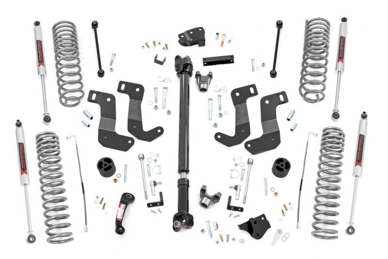 - Boosts Ground Clearance: Conquer challenging terrain with increased ride height for better off-road capability.\ Compatible with All Gladiator Models: Fits both Rubicon and non-Rubicon trims without modification.\ Upgraded Front Driveshaft Included: Maintains optimal driveline angles and durability under lift conditions.\ Progressive-Rate Coil Springs: Delivers a smooth, stable ride on and off the trail.\ Front Sway Bar Disconnects: Maximize articulation for aggressive rock crawling and off-road performance.\ Configurable Shock Options: Choose between N3 shocks for balanced performance, M1 monotube shocks for advanced damping control, or upgrade to M1R remote reservoir shocks for maximum cooling and high-speed off-road capability..