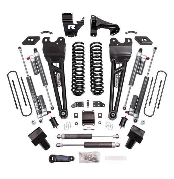 ReadyLIFT is proudly expands our industry-leading Super Duty lineup with the release of the all-new 6” MAX3.3 Coil Spring Suspension System for 2023–2025 Ford F250/F350 diesel 4WD trucks.This high-performance kit is engineered for customers demanding premium ride quality, larger tire fitment, and daily drivability — all backed by ReadyLIFT's reputation as the go-to brand for Ford truck lifts.\nKey Features:Dual Falcon Steering Stabilizer – Adds control and confidence with oversized tires on solid axles.\nHeavy-Duty Tubular Radius Arms – Built to correct suspension geometry and withstand Super Duty abuse.\nBolt-on Installation – No cutting, welding, or fabrication required.\n37” Tire Fitment – On 9” wide wheels with +18 offset.\nFalcon 3.3 Fast Adjust Piggyback Shocks – Terrain-tuned dampers with on-the-fly compression adjustability (Soft, Custom, Firm) and 8-position micro dial.\no 3.3 Fast Adjust Dampers offer a wide range of adjustability for specific terrain and/or handling characteristics with two separate knobs to tune to your preference.o 3-Position Fast Adjust Knob for Soft, Custom, and Firm Compression. Soft mode allows a partial bypass of the main piston for a softer rideo 8-Position Micro Adjust Dial offers refined damping adjustmentso Reservoir design increases nitrogen to oil ratio for consistent damping over wide temperature ranges.o Hard Anodized Large Bore 6061-T6 Aluminum Shock Body for impact and corrosion resistance as well as increased oil volume for consistent performance.o VOD (Volume Optimized Damping) features a digressive linear piston for quicker ramp-up for reduced body roll and an overall increase in damping to reduce bottom out when pushed to the limit.o Red Line high VI shock oil for consistent performance across all temperatures from -50F to 450F with anti-wear and lubricity agents.\nThis lift height reaches new heights for off-road performance and everyday utility — delivering improved ground clearance, aggressive stance, and outstanding ride quality both on and off-road.Diesel 4WD only. Tremor models will not achieve full lift height. Not validated for 2WD, gasoline powertrains, or single-cab configurations.