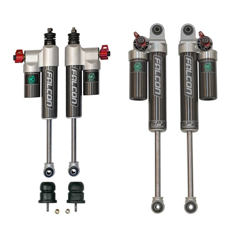 Tuned shock absorbers are one of the best bang for the buck upgrades for any vehicle. Proper damping can make or break the ride comfort and vehicle control, and low-quality factory units are quickly overwhelmed. Falcon's shocks represent a pinnacle of intelligent design. Built to our specifications and tune, we've applied everything we've learned over the years of tuning custom and modified vehicles to bring increased levels of comfort, compliance, and control to adventure vans and RV's. With a superior damper, we're able to effectively reduce sway from wind and obstacles, while simultaneously controlling large and small bumps more effectively.\nThe red 3.3 fast adjust knob combines industry leading adjustment range with intuitive and easy compression adjustment while the shock is installed. Position 1 is the lightest setting, great for blasting down washboard roads or rough city streets. Position 2 is a mid-setting with 8 micro adjustments, a great way to dial in the ride and handling setting for daily driver preference. Position 3 is the firmest setting, used for occasional heavy loads or when driving conditions require the most control. The shocks are manufactured as left and right pairs. The 3.3 fast adjust knob is placed in a spot that is easy to see and adjust.\nOur Bump Buddy jounce stops replace the factory hard rubber bump stops. These jounce stops are designed to control bottom out resistance in a smooth and progressive manner. Made to our exact specifications, and tuned to work in concert with our Falcon shock and strut packages, they are made from OEM grade microcellular foam which features excellent compression and rebound behavior.\nThese jounce stops are taller and more progressive than hard rubber original equipment bump stops. This allows the bump to contact the control arm at ride height, increasing resistance to sway and bottom out, but their progressive design prevents them from limiting overall suspension travel. The foam material is bonded to the mounting plate for longevity, and has excellent rebound damping properties to keep the vehicle in a precise state of control. We include these in all suspension systems and recommend them for nearly every van.