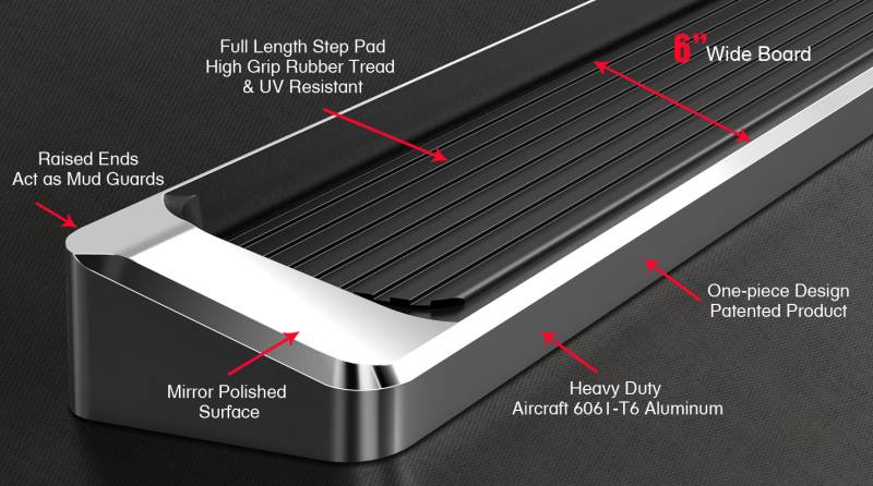 - The 6-inch-wide iRunning board comes with a full-length ribbed step pad design that provides maximum grip and secure and easy access to the vehicle.