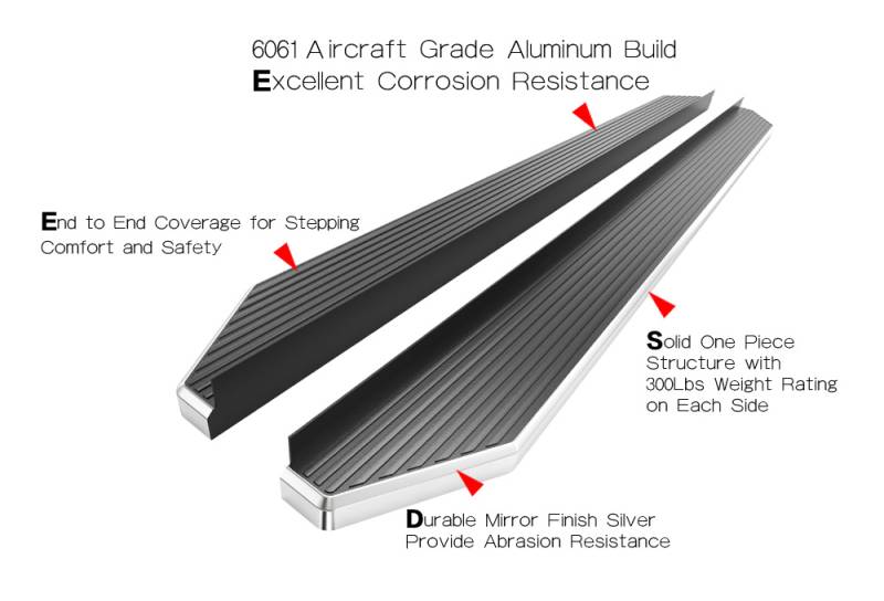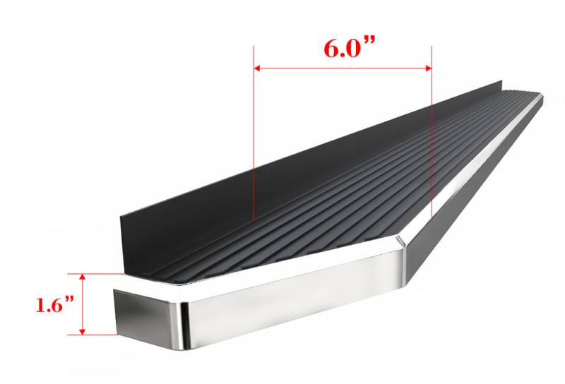 - The 6-inch-wide iRunning board comes with a full-length ribbed step pad design that provides maximum grip and secure and easy access to the vehicle.