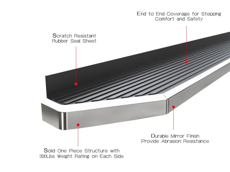 - The 6-inch-wide iRunning board comes with a full-length ribbed step pad design that provides maximum grip and secure and easy access to the vehicle.