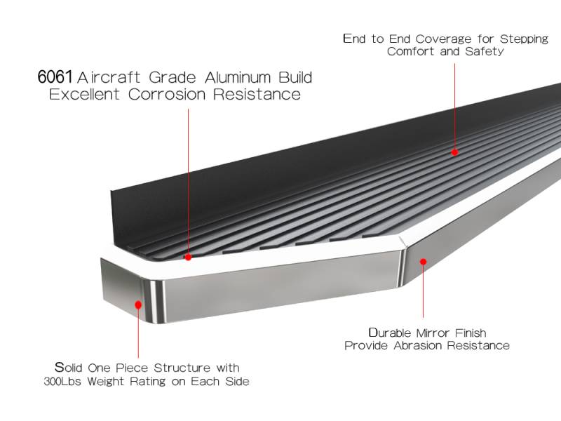 - The 6-inch-wide iRunning board comes with a full-length ribbed step pad design that provides maximum grip and secure and easy access to the vehicle.