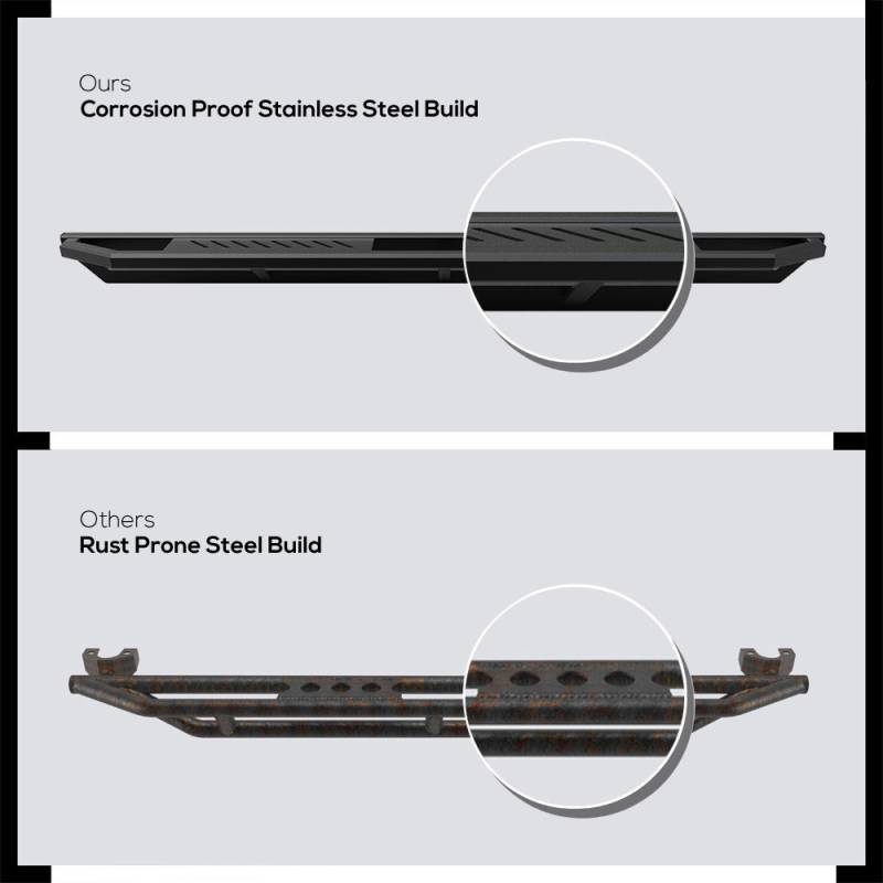 - The running board features heavy-duty stainless steel construction, ensuring durability and reliability.