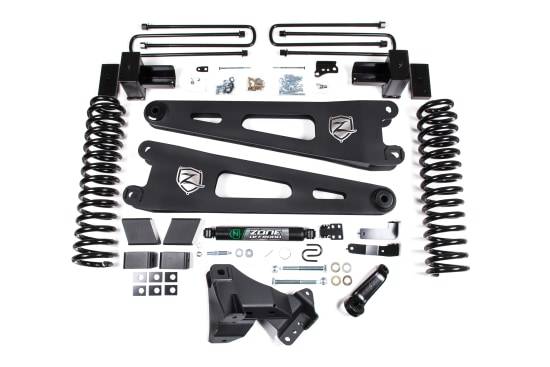 Take your Super Duty to new heights with this 4 Inch lift kit from Zone Offroad - now available for gas and diesel trucks! These kits can be cofigured with either radius arm drop brackets or upgraded to stout Zone HD Radius Arms for superior strength and durability.