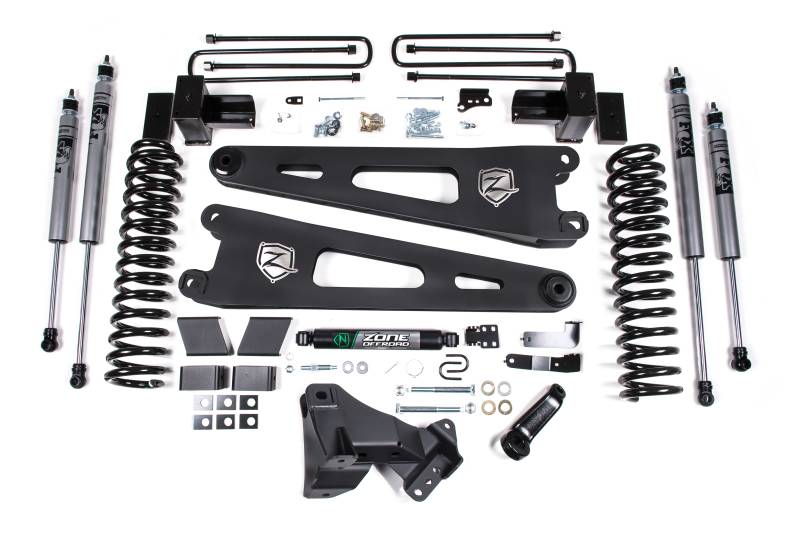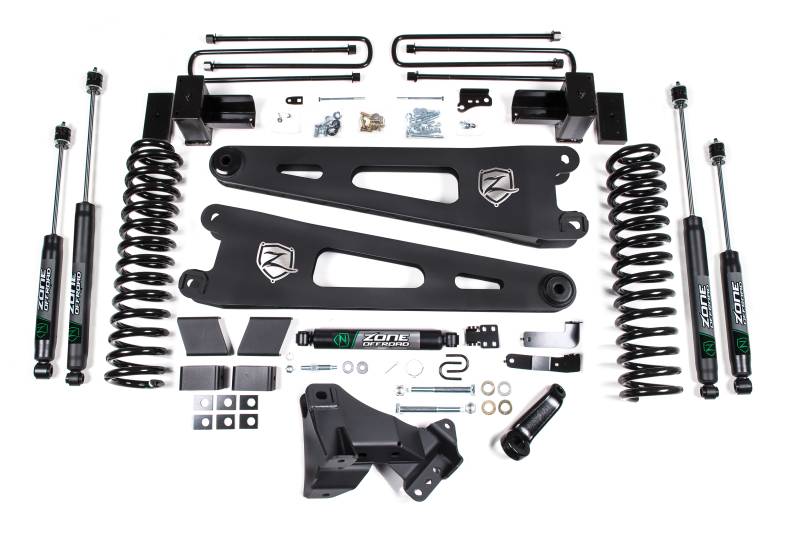Take your Super Duty to new heights with this 4 Inch lift kit from Zone Offroad - now available for gas and diesel trucks! These kits can be cofigured with either radius arm drop brackets or upgraded to stout Zone HD Radius Arms for superior strength and durability.