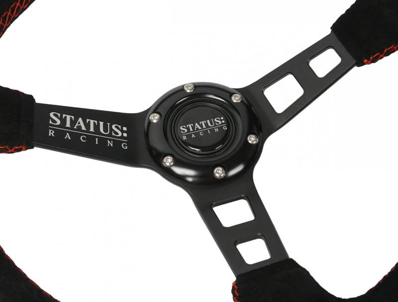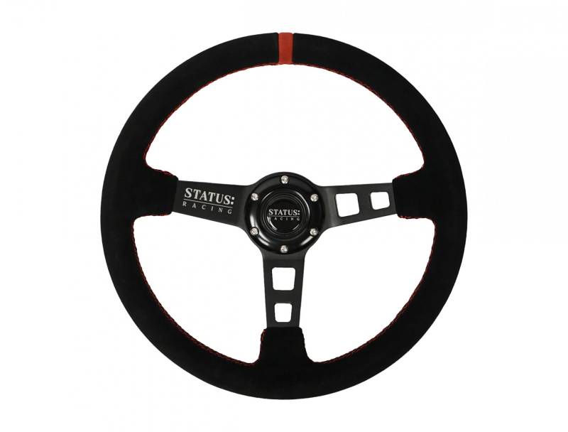 The steering wheel has 6 point bolt pattern, specifically chosen because it fits the majority of aftermarket hubs and quick releases. Includes a center Horn Button with Status emblem.