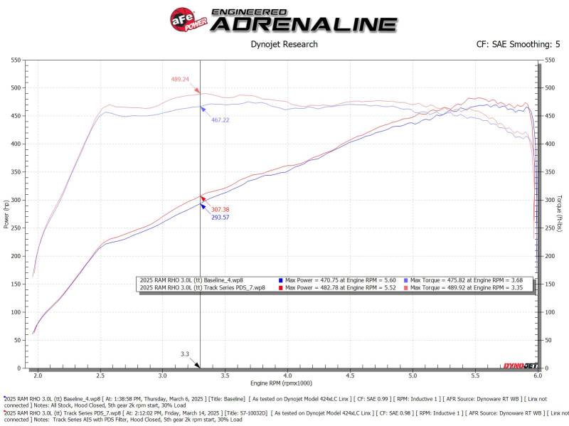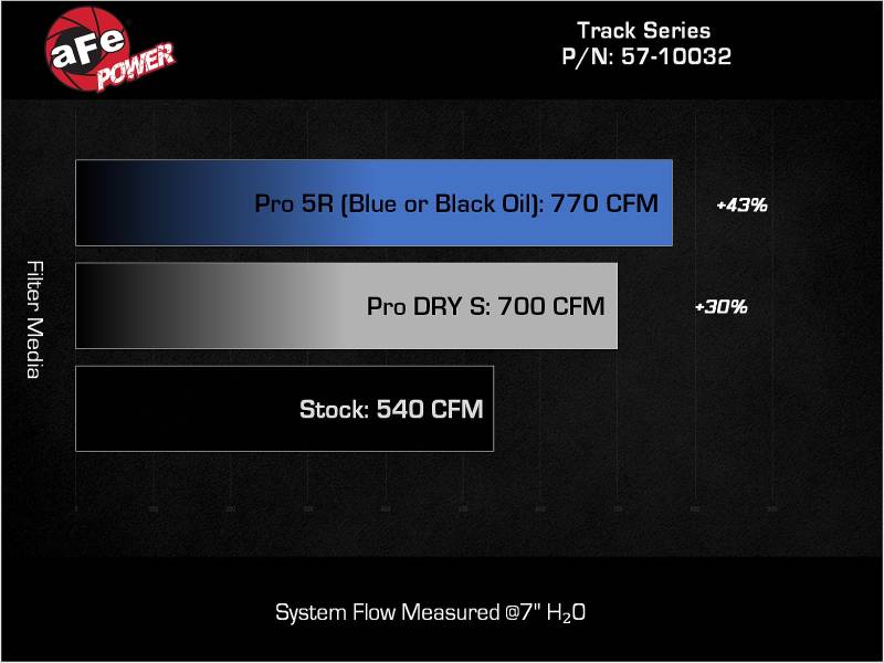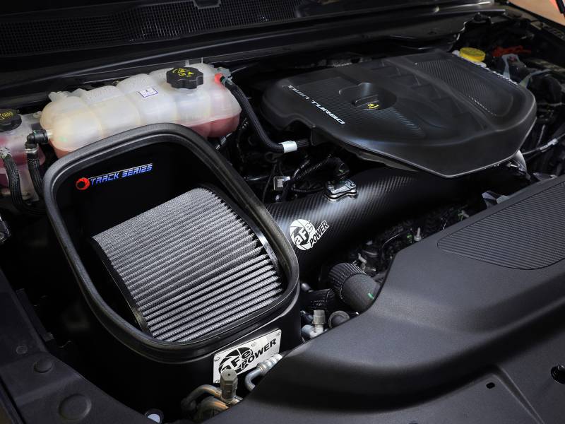 Designed from the ground up for the 2025 RAM 1500 RHO, the aFe POWER Track Series Air Intake System delivers uncompromising performance, cutting-edge materials, and factory-level fitment. This intake is purpose-built to unlock the full potential of your high-output Hurricane engine with increased airflow, refined aesthetics under the hood, and weight reduction. At the heart of this system is a specially engineered, high-flow conical air filter designed exclusively for the RHO platform. With a large, 360-degree radial flow design and deep pleats, this filter offers maximum surface area to trap dirt while maintaining unrestricted airflow. Built using aFe POWER’s oil-free Pro DRY S media with three layers of synthetic media for maximum convenience. Its progressive layering provides great filtration efficiency and dust holding capacity, while not requiring the use of oils. This media is best suited for street and light off-road use. Its inverted top makes for more filter surface area, resulting in longer service intervals. The Track Series cold air intake features a 100% carbon fiber intake tube that’s both lightweight and strong, optimizing air delivery to your engine while reducing heat soak. Weighing 6 Lbs less than the factory system—a 38% weight reduction—this intake not only improves performance but also contributes to overall vehicle weight savings.\nThe tube’s precise geometry is tailored to the RHO’s engine bay for seamless integration. Constructed from twill weave carbon fiber and finished in a rich matte coating, it perfectly complements the factory trim under the hood, adding a premium, motorsport-inspired touch to your RHO’s engine bay. The air filter is protected by a custom-molded housing constructed from cross-linked polyethylene (XLPE) for superior heat resistance and long-term durability. Designed to isolate the filter from hot engine bay air, the housing ensures cool, dense air is fed directly to the intake system—improving throttle response and overall performance. It installs cleanly into the factory location with no modifications required. The factory seal trim is seamlessly transferred to the aFe POWER housing, ensuring a clean, factory-style finish. Every component of the Track Series Air Intake System is engineered with precision, down to the hardware. It includes corrosion-resistant, black stainless-steel clamps with a matte tactical finish—similar to high-end firearm coatings—for a stealthy, rugged look. The kit comes complete with all necessary installation hardware, including a custom bracket to support the factory engine cover and secure all associated lines and harness. A flexible silicone coupling ensures a leak-free, vibration-resistant connection, even under aggressive driving conditions.