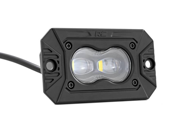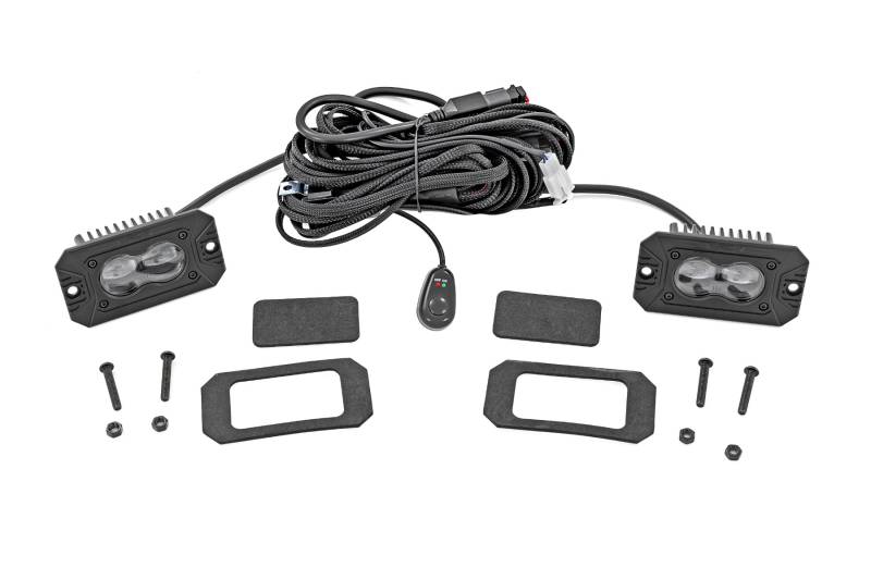 - Powerful Light Output: White delivers 4800 lumens per pair, while Yellow provides 4000 lumens per pair for versatile performance.\ Efficient Power Consumption: White draws 48 watts per pair, Yellow draws 40 watts per pair for balanced brightness and efficiency.\ Flush Mount Design: Sleek, low-profile fit for a clean and professional installation.\ Street Legal Performance: SAE J583 compliant for fog light use on public roads.\ All-Weather Protection: IP67 waterproof rating ensures reliable operation in rain, mud, and harsh conditions.\ Heavy-Duty Housing: Durable die-cast aluminum construction withstands off-road abuse and extreme environments.\ Moisture Breather Technology: Reduces condensation build-up behind the lens for long-lasting clarity.\ Premium Wiring Harness: Includes flat-wound wiring harness with an on/off switch for easy installation.\ Complete Pair Package: Sold in pairs for a balanced and powerful lighting upgrade.\ Backed Warranty: Protected with Rough Country's 3-year warranty for peace of mind..