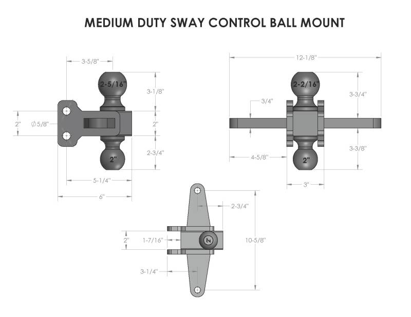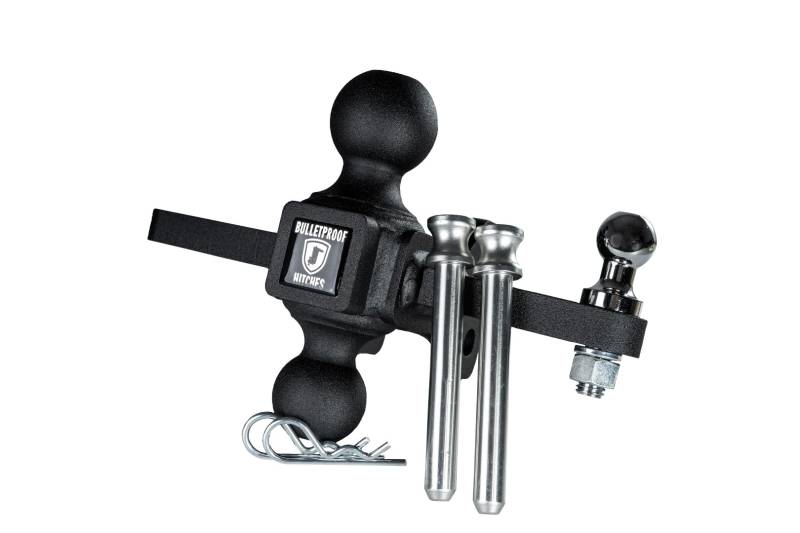 To equip your vehicle with a BulletProof Sway Control System, a mounting point for the sway control bar must be attached to the hitch. The BulletProof Medium Duty Sway Control Dual Ball Mount allows the connection between your hitch and your trailer. It is most useful in reducing sway on large, heavy loads. Made from solid steel, it features a 2" & 2-5/16" dual ball, along with 3/4" mounting plates on either side of the ball mount to allow the option of mounting the sway control system to either side of the trailer or to run two systems. Rated for up to 14,000 pounds of trailer weight and up to 2,000 pounds of tongue weight, it is compatible with all steel Medium Duty BulletProof Hitches®. It features the same black textured powder coat as the BulletProof Hitch® and comes with two corrosion resistant pins and R-clips to secure the ball mount into the channel of the hitch. *Note: Sway control system is sold separately