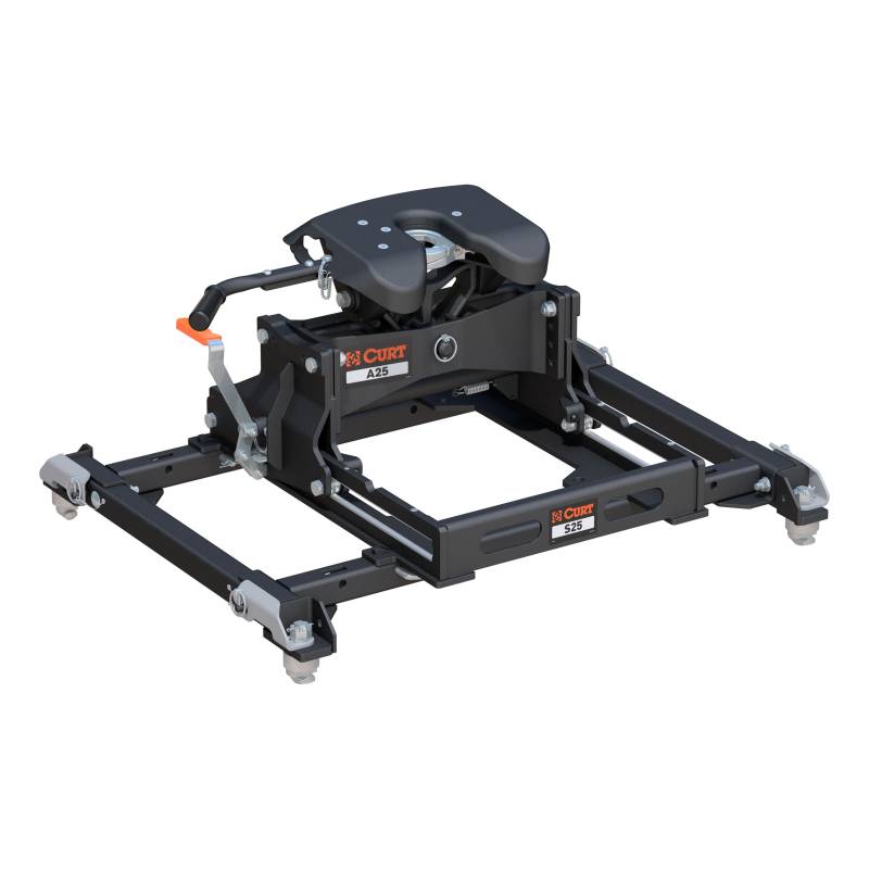 A25 5th Wheel Trailer Hitch Kit, Fits Select Ram 2500, 3500 Confidence meets comfort with the CURT A25™ 5th Wheel Hitch Kit. Engineered for long-haul dependability and everyday ease of use, the A25 is built to make towing less stressful and more enjoyable whether you’re pulling a luxury RV across the country or heading out for a weekend camping trip. At its core is a cast steel main body and fully articulating torsion head, designed to deliver stable, controlled towing with reduced shock and noise. High-strength, interlocking jaws wrap the kingpin completely, giving you peace of mind and a smoother ride. An extra-wide head opening and lockable, self-resetting handle make hitching easier and faster, so you can spend less time connecting and more time on the road. The A25 also brings practical convenience to every journey. A one-pin head removal system makes moving the hitch quick and manageable, while its automatic dual-direction latching means you only need to exit the truck once during hookup. For short-bed trucks, 12" of rearward travel provide the extra clearance you need to maneuver confidently in tight spaces. Tested to 25,000 lbs. and finished with a durable carbide powder coat, the CURT A25 5th Wheel Hitch Kit is built to last and backed by a limited lifetime warranty. Includes A25 5th wheel hitch head (#16580), S25 5th Wheel Slider (#16574), and Puck System 5th Wheel Adapter with Rails (#16042). Cast yoke with poly-torsion inserts to suppress shock loads and reduce noise Fully articulating torsion head for controlled coupling and stable towing Lockable handle self-resets to the ready-to-couple position after uncoupling Constructed with a cast steel main body for a more precise build High-strength, interlocking jaws fully wrap the kingpin to minimize noise