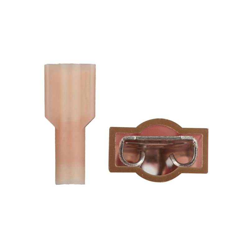 3M Red Nylon Female Quick Disconnect 22-18 Gauge .250 Metra 3M Red Nylon Female Quick Disconnect 22-18 Gauge .250. The disconnects are attached to mating part by tongue of female part slipping over male tab. The use of dents and rolled edges on female part provides excellent holding force while allowing easy and quick disconnect. Fully Insulated Package of 100 This terminal has a wire range of 22-18 AWG Mates with male tab .250” Width Nylon-insulated, butted-seam barrel with a funnel-designed, seamless brass sleeve offers easy insertion of wires Dents and rolled edges of this female disconnect terminal offer excellent holding force