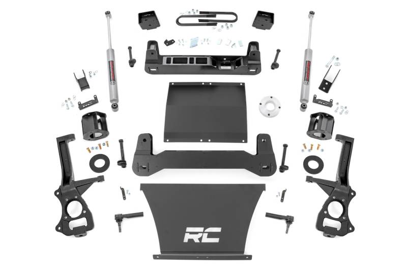 Explore New Heights: GMC's fourth-generation Sierra 1500 features an impressive all-new design that's built from the ground up, with aggressive angles and head-turning stylings that fit in beautifully when transformed with Rough Country's 6-inch Suspension Lift.Innovative Design and Construction: When changing a vehicle's suspension, the key to preserving ride quality is keeping the geometry of all suspension components as close to their factory angles as possible. This suspension kit combines the use of durable steel knuckles and drop cross members to reduce control arm angles and simulate factory angles all while achieving new heights. Featuring a set of upper strut spacers that offer uncompromised strength and rigidity, gaining lift height is no issue. Completing the rear of this suspension kit is a set of rear blocks, shocks, and u-bolts that allow you to retain factory-like geometry. This combined setup provides enough clearance to run 35" tires without additional modifications. We didn't want to limit you to one standard kit. Rough Country's 6-inch kit is configurable with all the shock options that we offer. This allows you to choose which shock series you want! Ranging from our nitrogen-charged N3 shocks to our Vertex reservoir shocks the power to choose is in your hands.Installation: With minor cutting and a strut compressor required to install, an estimated timeframe of 8-10 hours is recommended to complete this full installation. This full kit can be installed at home and can be completed efficiently and quickly!Limited Lifetime Replacement Warranty: Rough Country's 6" Suspension Lift Kit is backed with a limited lifetime replacement warranty towards manufacturer defects. As such, the product is protected from structural and workmanship damage after the date of purchase. With our industry-leading warranty give yourself peace of mind when using Rough Country's Suspension products!
