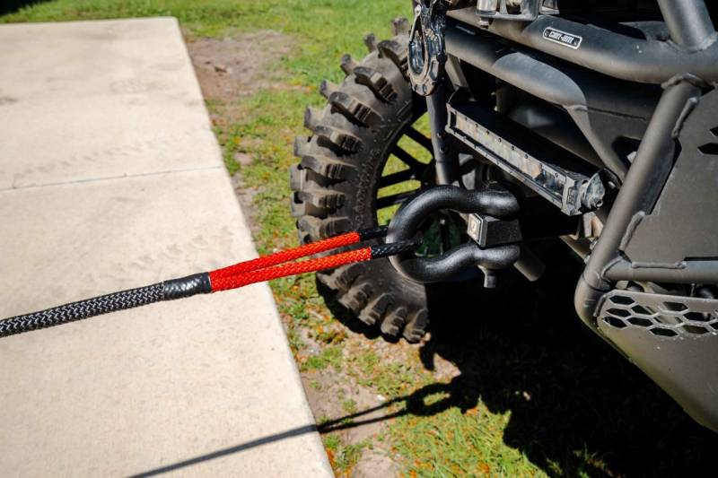 The BulletProof Light Duty 1/2" x 20' Kinetic Recovery Rope is the ultimate choice for all your serious recovery needs and has been designed for strength, durability and reliability. It is a 100% double-braided nylon rope that is UV and water-resistant. Rated to a breaking strength of 7,700 pounds and comes in black with red loops for higher visibility, especially important in low light conditions. With a stretch factor of up to 30% of its original length, it is designed to assist in the recovery of ATVs, side-by-sides or snowmobiles that are stuck and may require being pulled out It is also very useful for flat towing in tight trails. It is stronger than wire ropes and will not snap during towing. The BulletProof Light Duty Kinetic Rope has been designed to withstand the toughest situations, terrains and can hold up in the harshest of conditions.