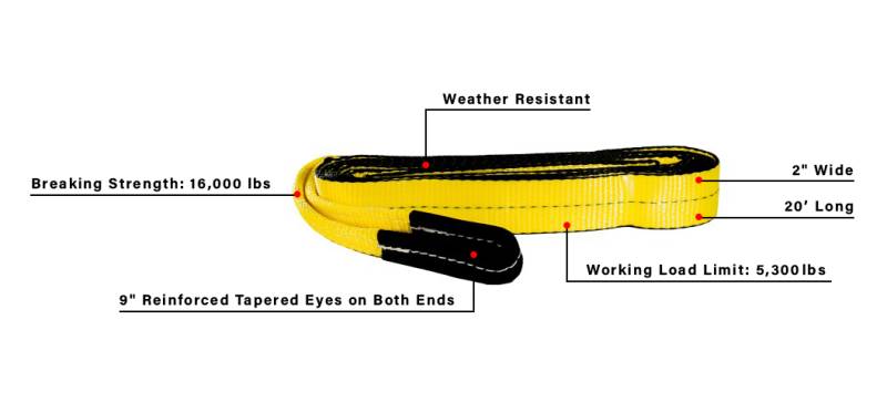 The BulletProof Medium Duty 2” wide x 20-foot-long Tow Strap is designed with safety, durability, and ease of use in mind. Made from durable and weather-resistant polyester webbing, the strap features reinforced loops on each end. The reinforced loops not only protect the strap when connected to the tow point, shackle or other strap/rope but also help to prolong the life of your strap. With a working load limit of 5,300 pounds and a breaking strength of 16,000 pounds, it is a perfect choice for those times that you need to tow a vehicle or recover a Jeep, side by side or ATV.