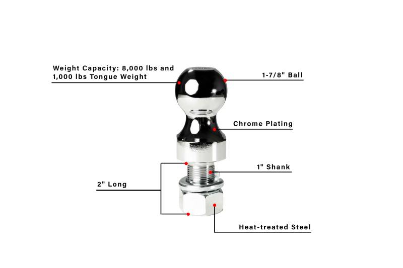 The BulletProof 1-7/8" Threaded Ball features a 1" threaded shank that is 2" in length with a lock washer. It provides a connection point for your trailer coupler. Made from high-strength, heat-treated steel and features a chrome plating that provides enhanced corrosion resistance. Rated for up to 8,000 pounds of trailer weight and up to 1,000 pounds of tongue weight. The BulletProof Threaded Balls can be used on the BulletProof Light Duty Drop Tang Attachment or anything with a 1" hole.