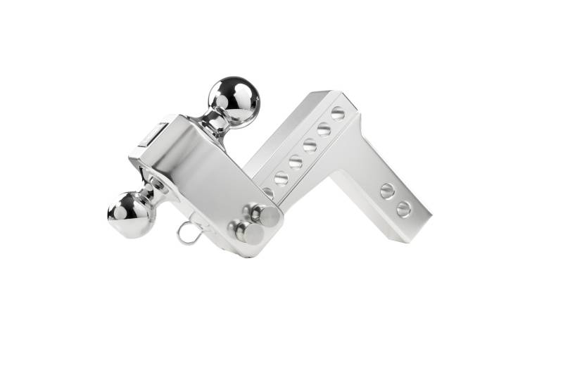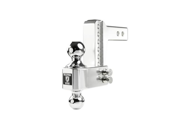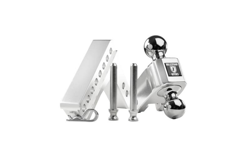 The BulletProof Medium Duty 2” shank, 4” drop/rise Aluminum Hitch is the ultimate choice whether you are towing for work or for fun. With a max towing capacity of 14,000 lbs. and 2,000 lbs. of tongue weight, the BulletProof Medium Duty Aluminum Hitches are the highest rated on the market. Built from 6061 T6 grade aluminum to be lightweight yet still offer the same high weight capacities you have come to trust from BulletProof Hitches®. The hitches are machined to an extremely tight tolerance for a precision fit. Polished for a sleek look to accent any vehicle and guaranteed to never rust. The aluminum hitches come standard with a 2” & 2-5/16” dual ball that is adjustable in 1” increments. This hitch offers 7 levels of adjustment to ensure you are towing level, which allows for a safer and more comfortable towing experience. This hitch is the perfect choice for vehicles with a receiver height of 18”-19” (ground to the bottom of the receiver tube). It has an overall length of 8-5/8".