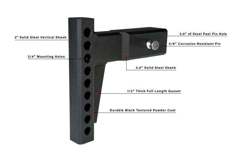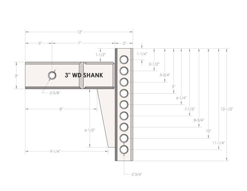 The BulletProof 3" Weight Distribution Shank is the ultimate choice for those times you need to use a weight distribution system. This solid steel shank allows you to connect almost any weight distribution system. After modifying your vehicle's suspension and/or adding larger tires, you may need a longer drop. The shank can be used in the drop or the rise position. The vertical shank is 2" wide and the holes are 3/4" in diameter and spaced 1-1/4" on center. This allows for more adjustment of the WD head to ensure you are towing level. Offers 7 different ride heights. Rated to 22,000 lbs trailer weight and 3,000 lbs tongue weight. Note: The BulletProof Locking Pin is NOT compatible with the BulletProof 3" Weight Distribution Shank. *This is the shank ONLY.