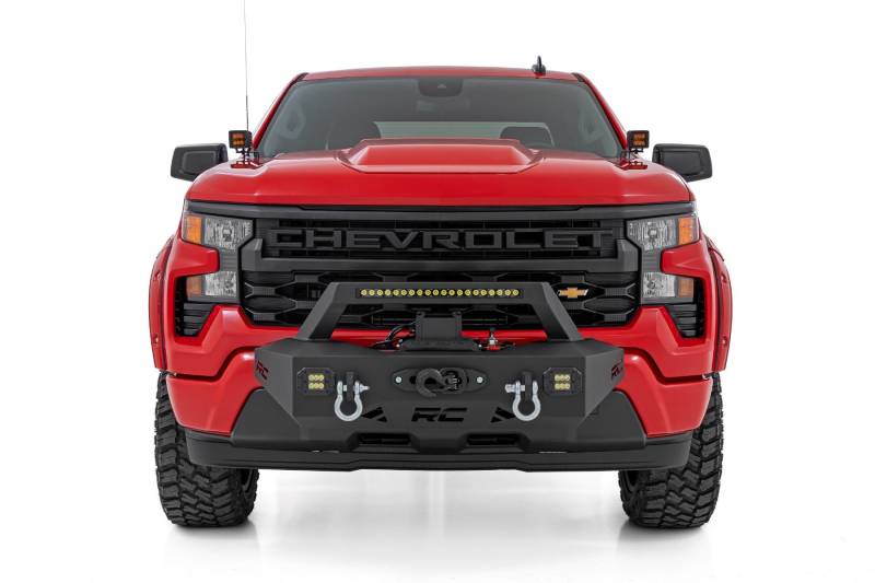 Transform Your Silverado with Rugged Style and Recovery Power: Upgrade your fourth-generation Chevy Silverado 1500 with Rough Country's EXO Winch Mount System. Designed to bolt directly over your factory bumper, this innovative system delivers a bold, aggressive look while adding serious functionality. With integrated recovery points, powerful lighting, and a heavy-duty winch platform, your Silverado will be ready for any trail or recovery situation.Built for Performance and Durability: The EXO Winch Mount features a 1/4-inch thick steel construction built to handle the toughest pulls. A protective winch guard shields your equipment, while reinforced heavy-duty D-rings provide secure and reliable recovery points. The mount is compatible with Rough Country winches as well as most standard 4-bolt pattern winches (4.5 in x 10 in), ensuring versatility and strength where you need it most.Brilliant Lighting and Secure Installation: Light up the night with a complete LED package, including a Rough Country 20-inch Black Series Single-Row Light Bar and two 2-inch Black Series LED Cubes delivering a combined 12,000 lumens of powerful illumination. Installation requires cutting and drilling for a secure, long-lasting fit. Once installed, the system delivers unmatched styling, recovery performance, and lighting power for your Silverado 1500.
