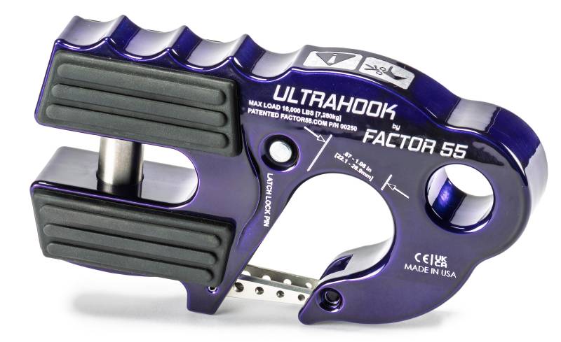 ULTRAHOOK WINCH HOOK WITH SHACKLE MOUNT -- PURPLE Ultrahook was developed to meet the needs of off-road racers who needed the speed of a hook and the functionality of closed system winching. Featuring industry-first closed system shackle mount hole machined into the body of the hook. The safety latch fits securely into a machined pocket and has an integrated secondary locking feature. The latch locking pin is stored in the body of the UltraHook and can be inserted into the hook tip, locking the latch into place. Featuring EPDM rubber pads for fairlead protection, titanium double shear pin, and a finger grip feature that promotes proper ?Hook-Up? orientation.