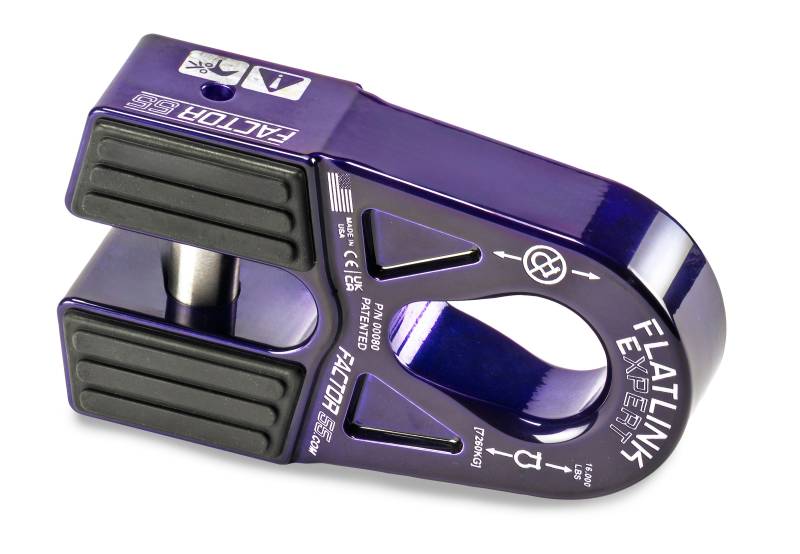 FLATLINK "E" EXPERT WINCH SHACKLE MOUNT -- PURPLE The FlatLink E (Expert) provides a means to eliminate the conventional winch hook and replace it with a safer and more secure screw pin or soft shackle resulting in a CLOSED SYSTEM WINCHING operation. The large pear-shaped shackle mounting hole allows for attachment to either the pin or bow end of common 3/4? screw pin shackles, soft shackles, and common OEM recovery points. Conventional winch hooks can cut and fray recovery straps and often allow strap ends to escape during momentary slack cycles of a typical winching recovery. The FlatLink E does not require splicing and is compatible with steel cables or synthetic ropes up to 3/8 inches in diameter. The cable eye is retained in the FlatLink E by a 5/8? diameter titanium double shear pin and internal snap ring. Installation takes only minutes. The FlatLink E stows neatly against either roller or hawse type fairleads. EPDM rubber guards protect alloy fairleads and are securely attached with 4 barbed tips each.
