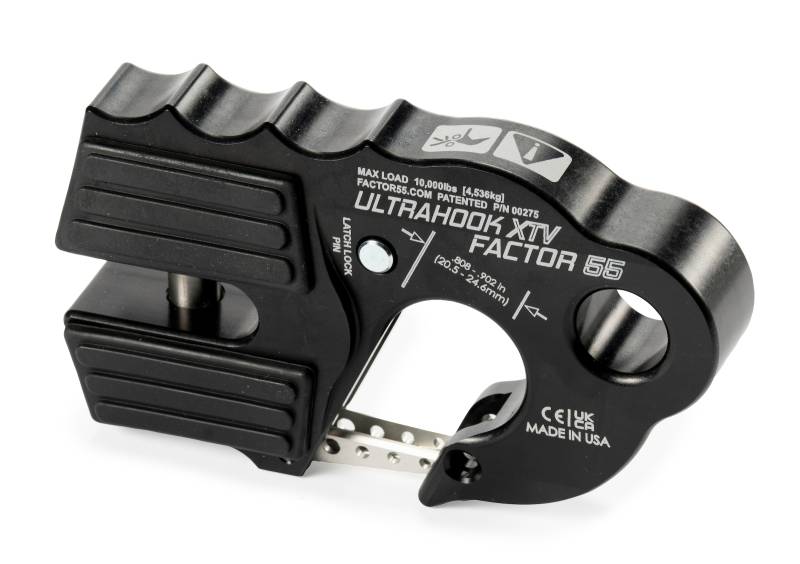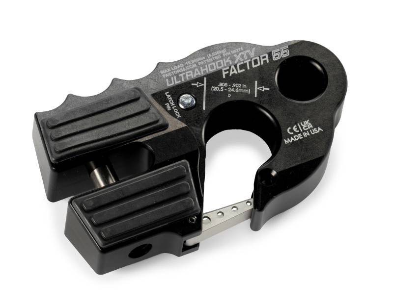 ULTRAHOOK XTV WINCH HOOK WITH SHACKLE MOUNT -- BLACK Low-profile Ultrahook XTV was developed to meet the needs of off-road racers who needed the speed of a hook and the functionality of closed system winching. Featuring industry-first closed system shackle mount hole machined into the body of the hook. The safety latch fits securely into a machined pocket and has an integrated secondary locking feature. The latch locking pin is stored in the body of the UltraHook XTV and can be inserted into the hook tip, locking the latch into place. Featuring EPDM rubber pads for fairlead protection, titanium double shear pin, and a finger grip feature that promotes proper ?Hook-Up? orientation.